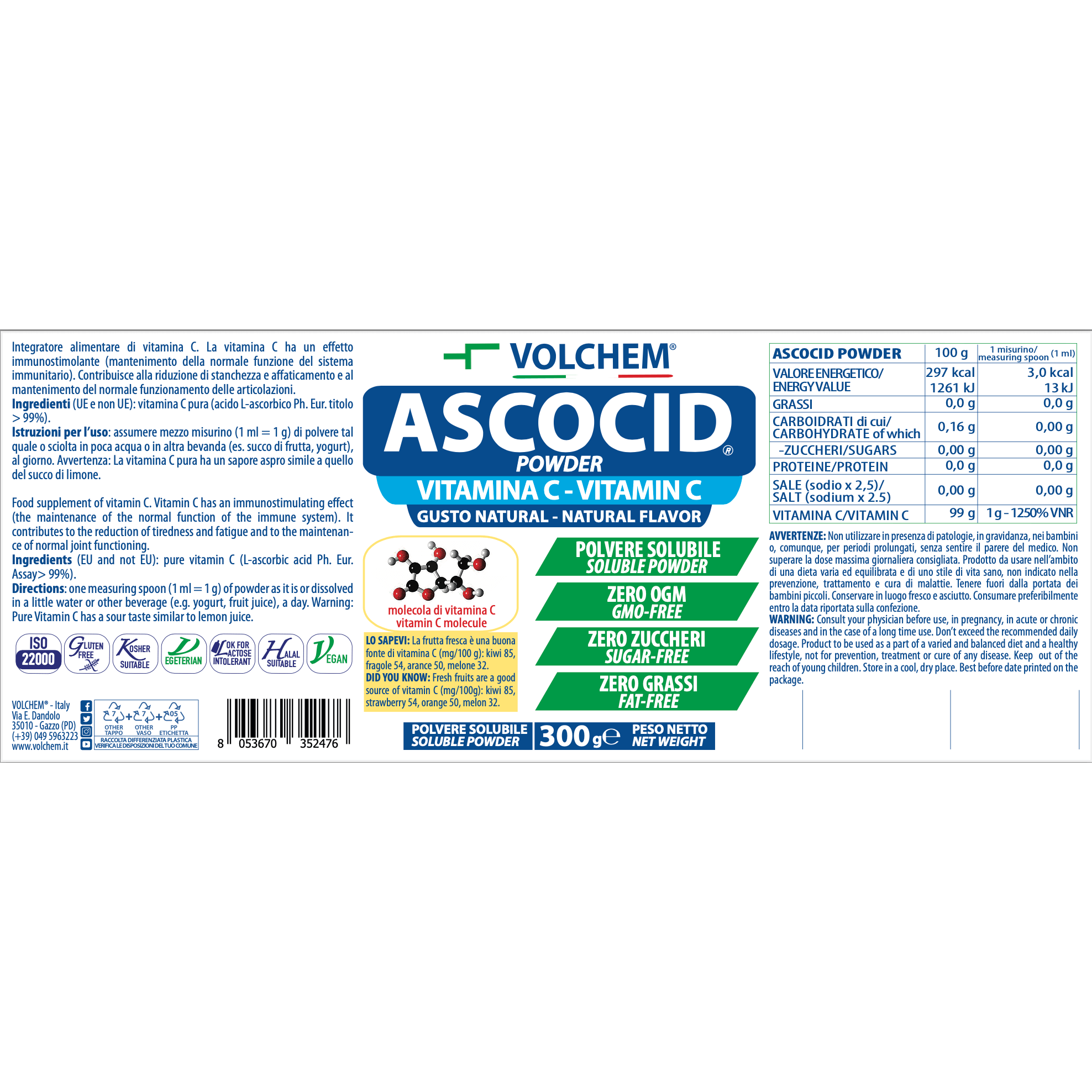 Ingredients (natural flavor): pure vitamin C (L-ascorbic acid Ph. Eur. Assay> 99%).