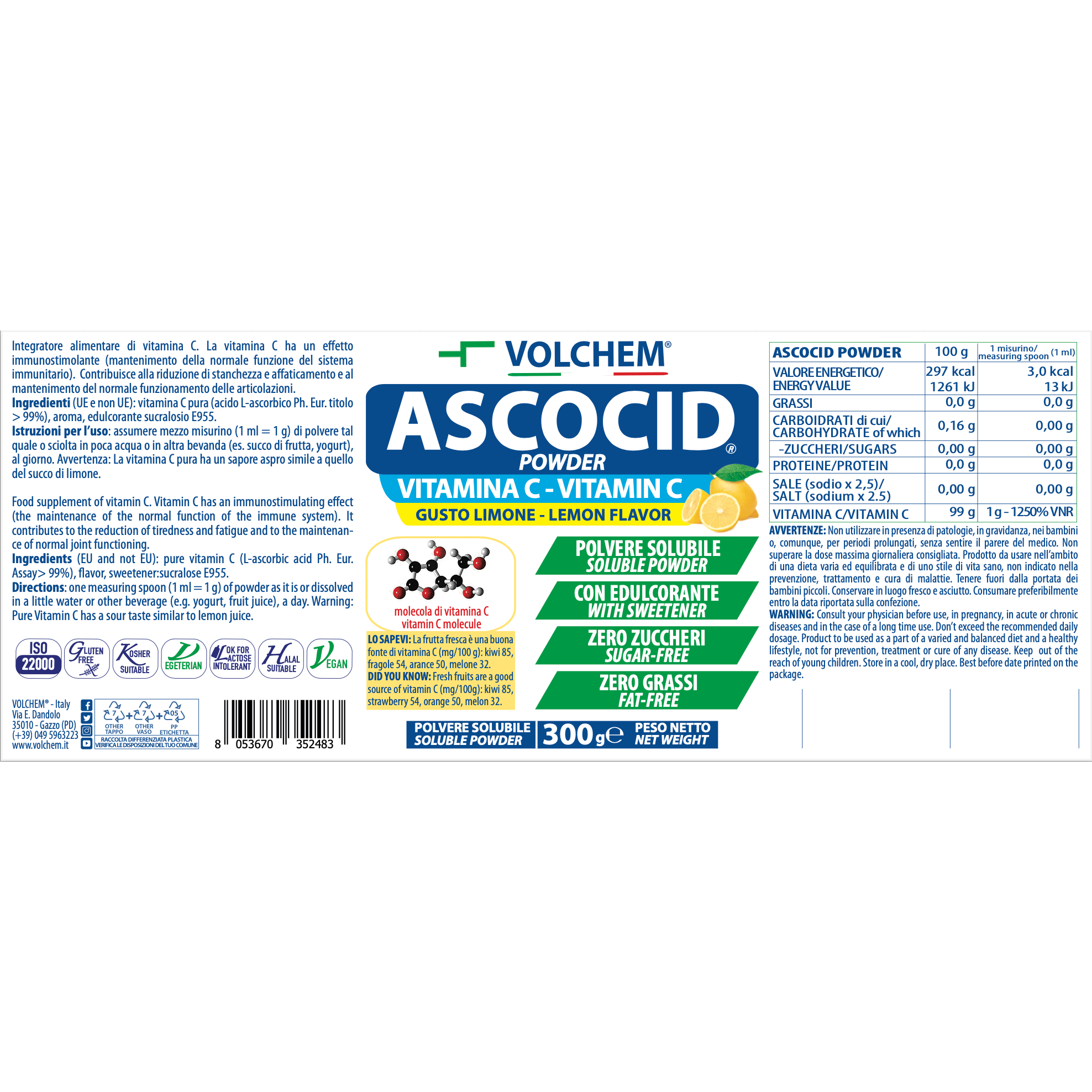 Ingredients (lemon flavor): pure vitamin C (L-ascorbic acid Ph. Eur. Assay> 99%), flavor, sweetener:sucralose E955.