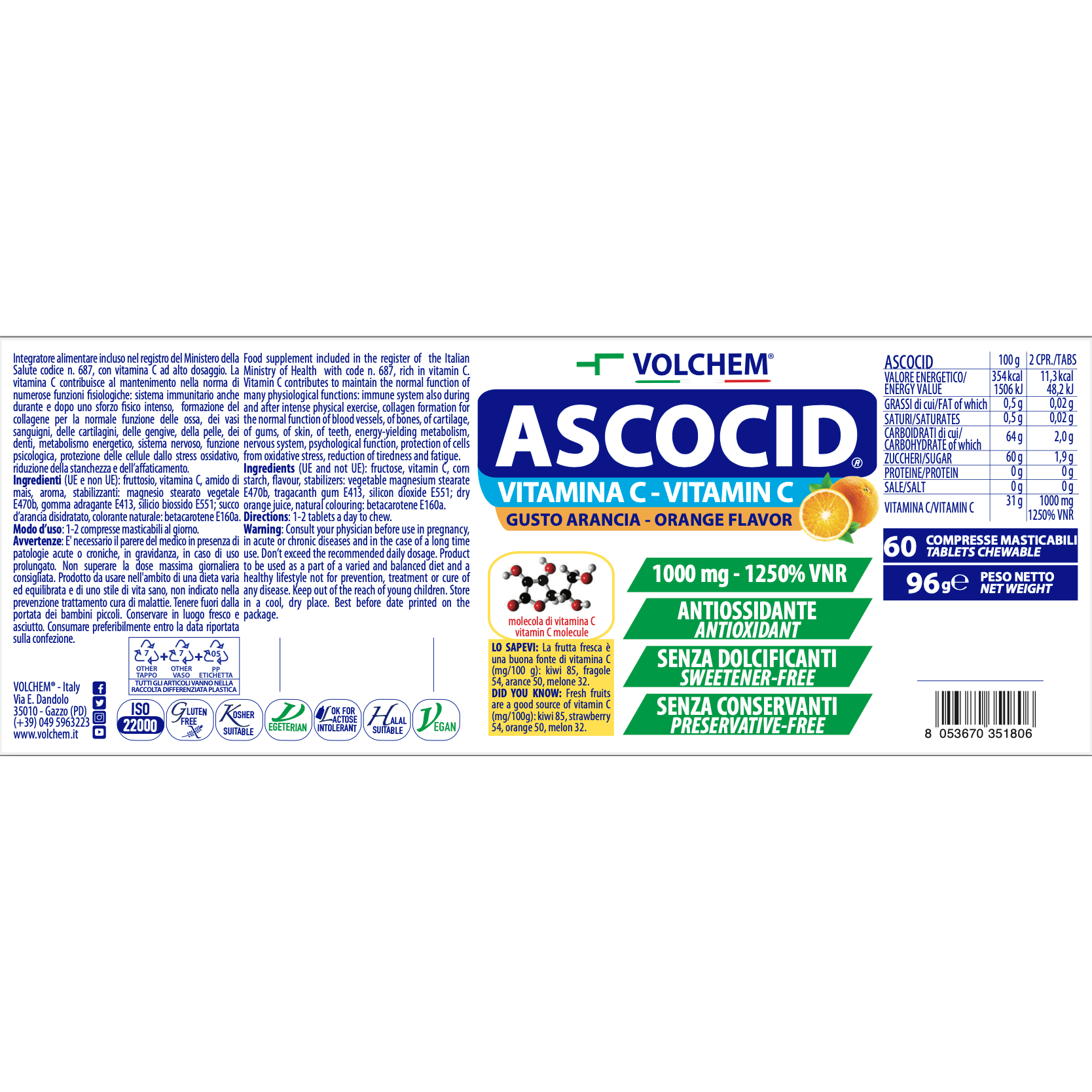 Go to cartAscocid® is a dietary supplement registered with the Italian Ministry of Health, featuring a high dosage of vitamin C. The chewable tablet format, with a pleasant orange flavor, is ideal for individuals who have difficulty swallowing pills.
